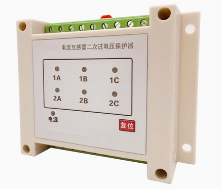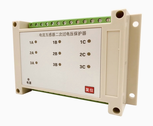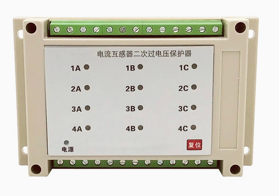 电流互感器保护器是多回路保护器。安装于开关柜二次导轨上。保护器本身有复位按钮,有远程复位端子(J1、J2)可以延伸到操作部位,保护输出的同时有继电器的闭合触点输出(K1、K2)可以用于自动化连锁。