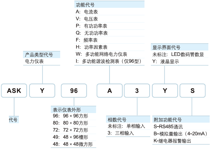 ASKY80W3多功能网络电力仪表系列产品采用先进的微处理器和数字信号处理技术,可测量电网中的单三相电压、电流、有功功率、无功功率、功率因数、电网频率、有功电度、无功电度等各种常用电力参数,同时还可选带开关量输入、报警输出、模拟量变送输出、脉冲输出、RS485网络通讯功能。