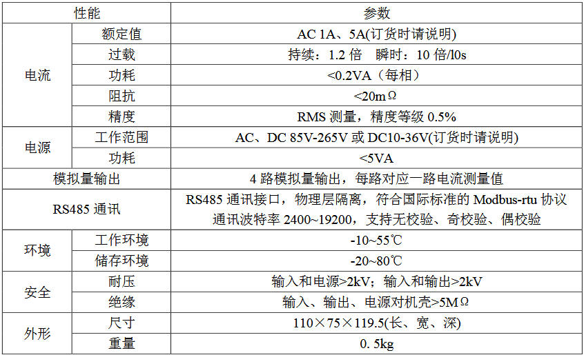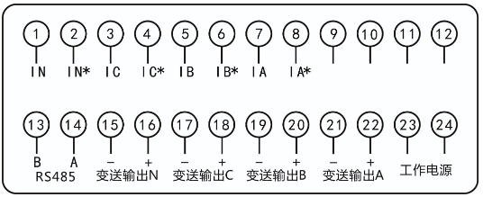 模拟量变送输出可选:DC0~20mA、DC4~20mA、DC0~5V、DC0~10V等。模拟量变送输出与输入信号隔离,成线性对应关系,每路测量电压对应一路模拟量变送输出,广泛用于PLC、DCS等数据采集。精度0.5%;电流输出时,负载电阻<500Ω、电压输出时,负载电阻>100KΩ。