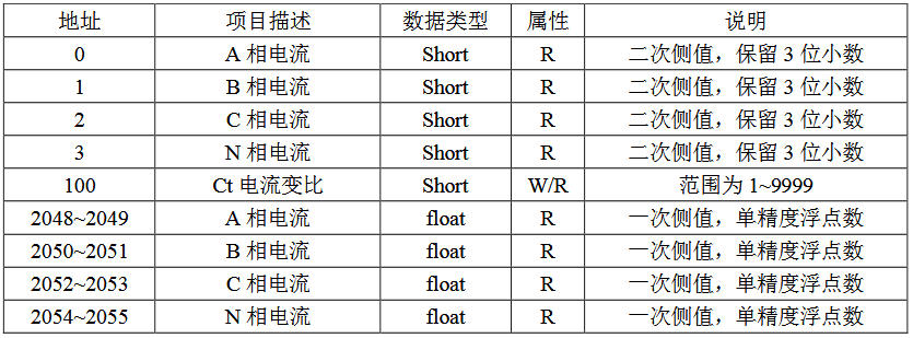 (4) 寄存器地址0,1,2,2048~2049,2050~2051,2052~2053三相四相接线方式,读出的为相电压,三相三线接线方式,读出来的线电压。